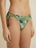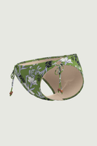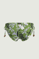 Cinched to perfection: the Wild Hibiscus Black Ruched Side Tie Pant. Soft side ruching flatters every curve while drawstrings glide through gold hoops and finish with brown bead tips for effortless adjustability. Full classic coverage in subtly shimmering black floral - your new go-to bottom.