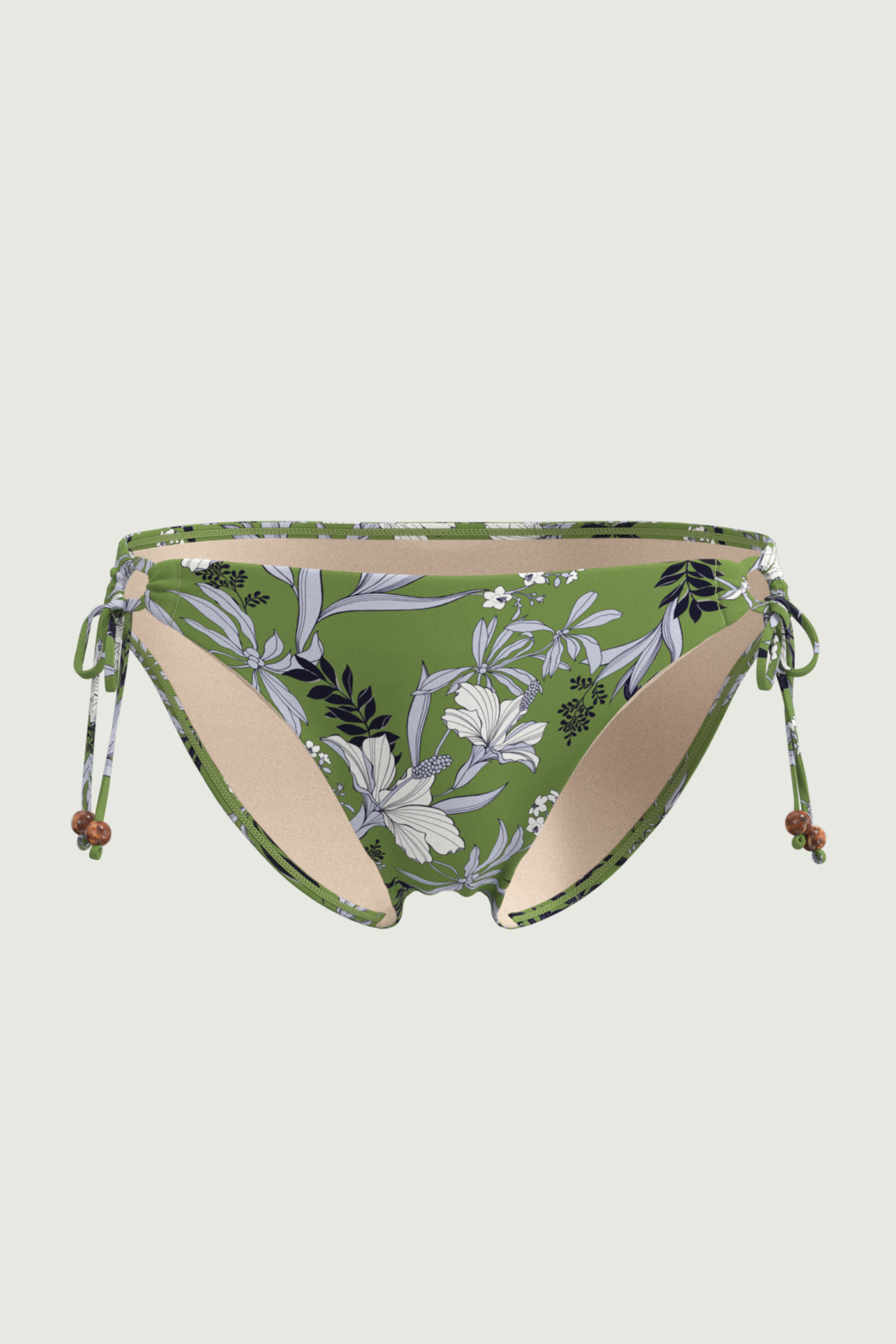 • Side hoops + drawstrings with brown bead ends