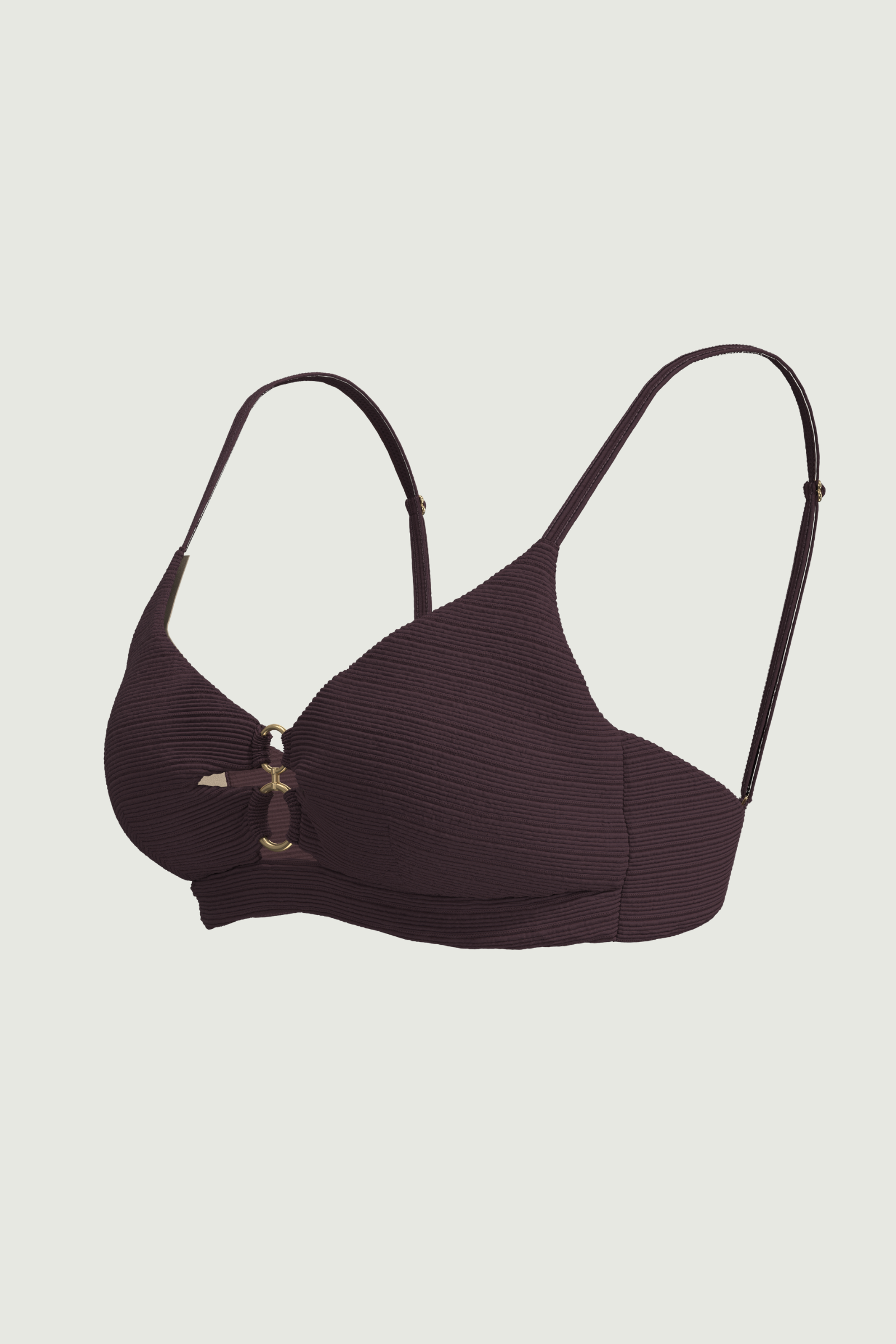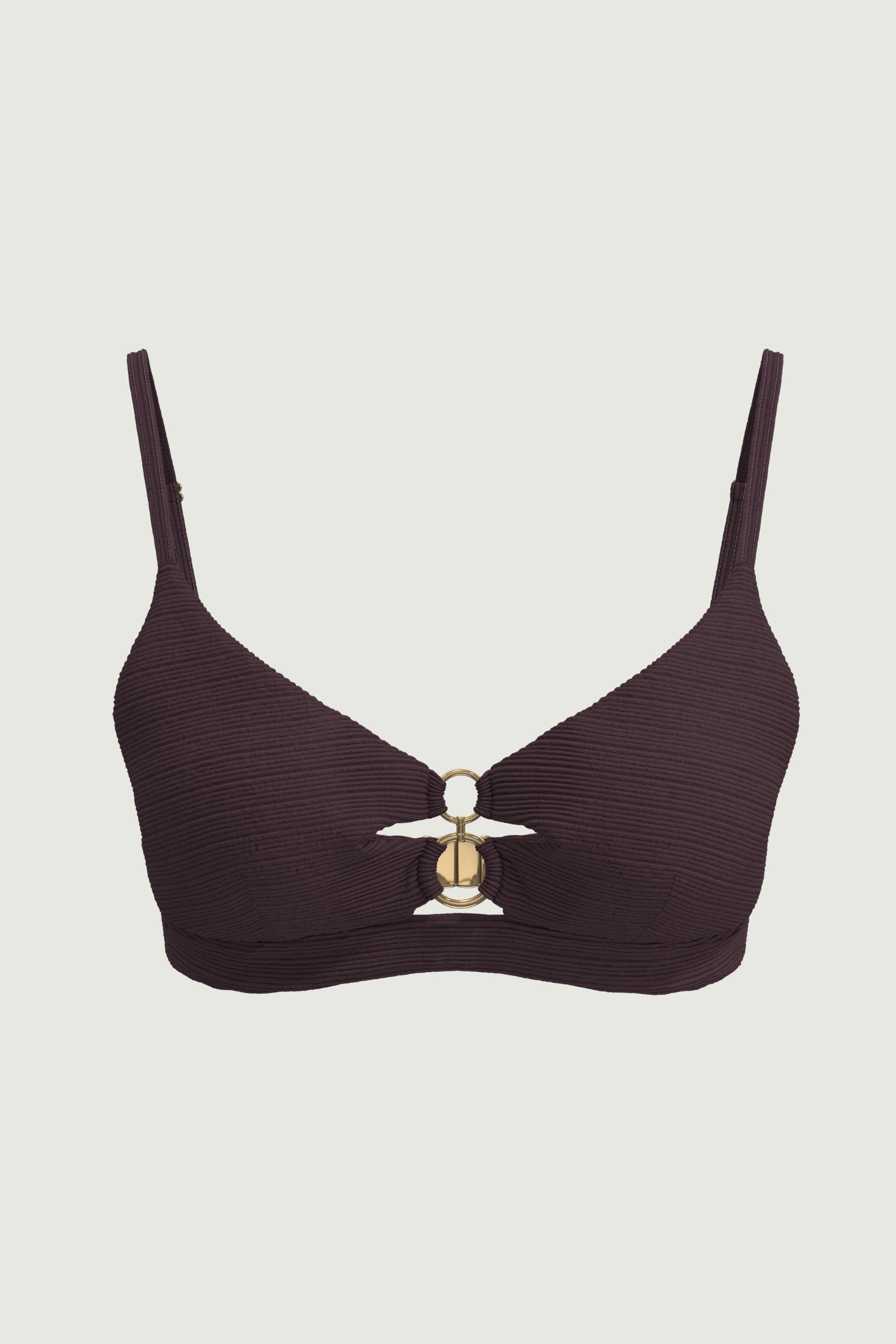 Ignite understated glamour with the Maja Cut-out Ring Top. Dual front cut-outs connected by a gleaming gold double hoop create a daring yet refined focal point, while removable pads offer customizable lift for B/C busts. Whisper-thin straps frame the shoulders, and solid fabric with horizontal mini ribbed texture delivers a sleek, tactile finish perfect for bold, sunlit confidence.