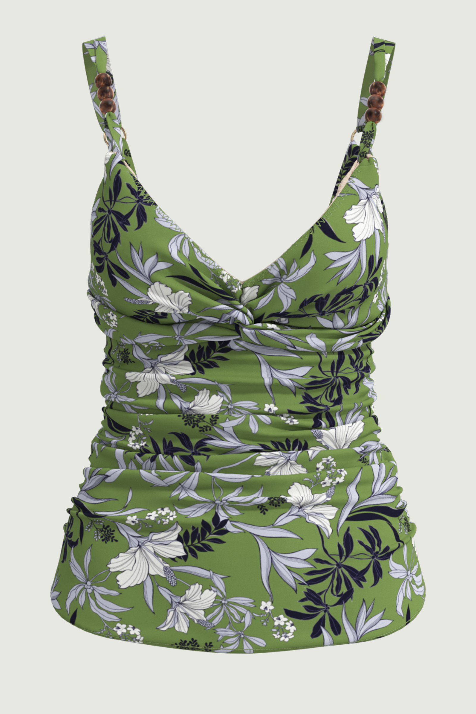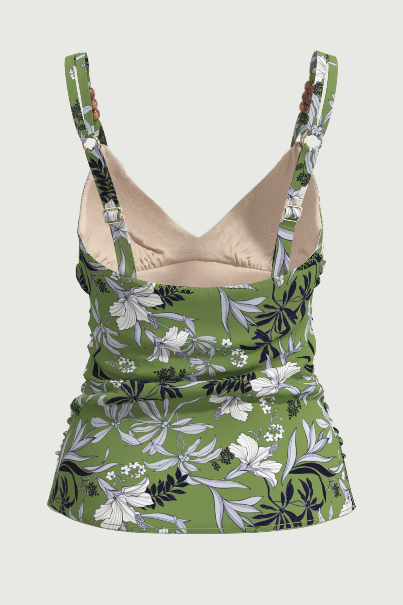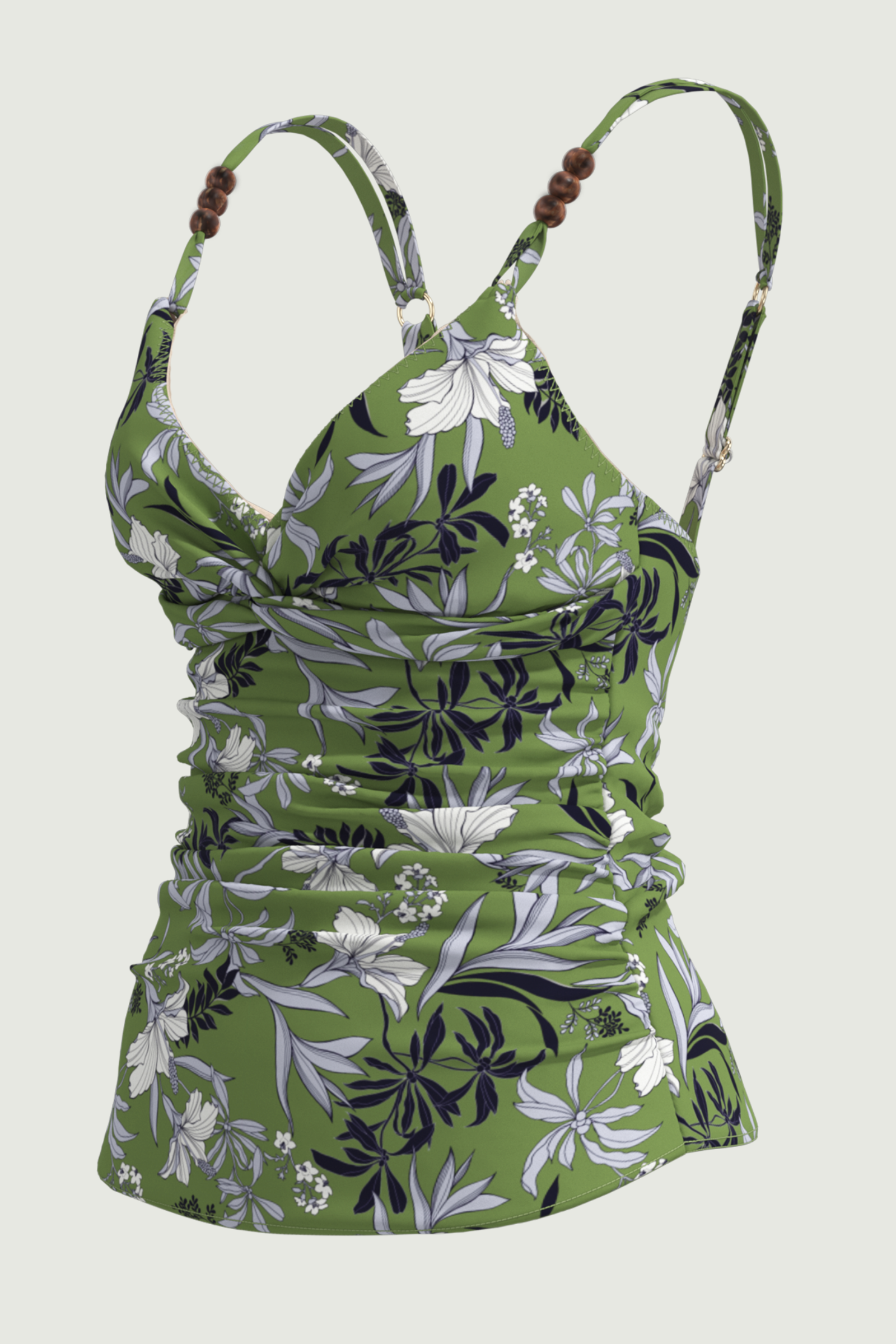 Elevate your silhouette with the Wild Hibiscus Plus Cup Tankini. Hidden underwiring delivers discreet lift for fuller busts (D/DD), paired with removable cups for customizable shaping. Sleek straps accented by gleaming hoops and brown bead details add an artisanal touch, all atop a vibrant floral pattern on subtly shimmering fabric - your empowering essential for poised, pattern-playful poolside moments.