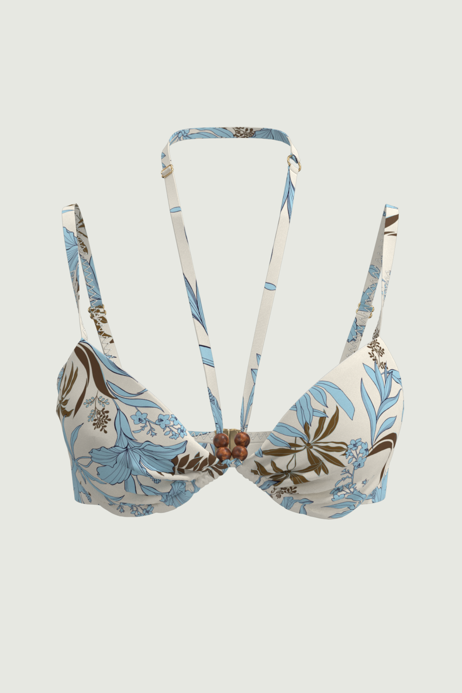 Radiate exotic charm in the Wild Hibiscus Neck Strap Underwire Top. Moulded underwire cups lift and shape B/C busts with precision, while a deep V-line is framed by extra straps that loop elegantly around the neck - accented with brown beads at the center for a touch of earthy luxe. Floral patterns dance across subtly shimmering fabric, creating a captivating, sun-ready silhouette.